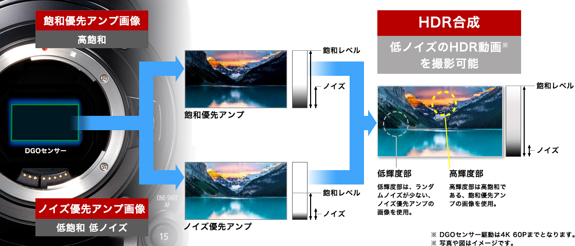 DGOセンサーは一つの画素出力に対して、異なるゲインで出力することで低ノイズのHDR動画を生成する新開発のイメージングシステムです。明るい部分は飽和優先アンプの画像を使い、暗い部分はノイズの少ないノイズ優先アンプの画像で撮影した画像を合成し高ダイナミックレンジを実現します。デュアルピクセル CMOS AFとの両立にも対応しています。