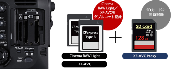 記記録媒体にCFexpressカードを採用。2スロットを装備し、リレー記録、同時記録が可能。データのバックアップや受け渡しに便利です。またSDカード※にProxyデータを同時記録することができ、編集作業を効率化します。