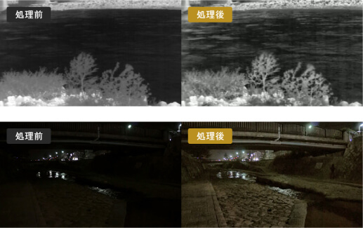 近赤外線(サーモ)カメラなど、現在でもアナログが主流の河川・海上・建設現場監視に向けて、暗視/低コントラスト条件下で“更なる視える化”を推進します。