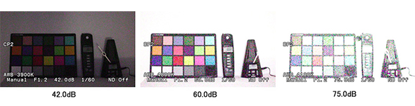 ※1 最大ゲイン75dB時。一般社団法人電子情報技術産業協会(JEITA)発行の「CCTV機器スペック規定方法」(TTR-4602B)に準拠。 (カラー/蓄積なし/F1.2 / 30P / 50IREの条件下で撮影した場合の理論値)